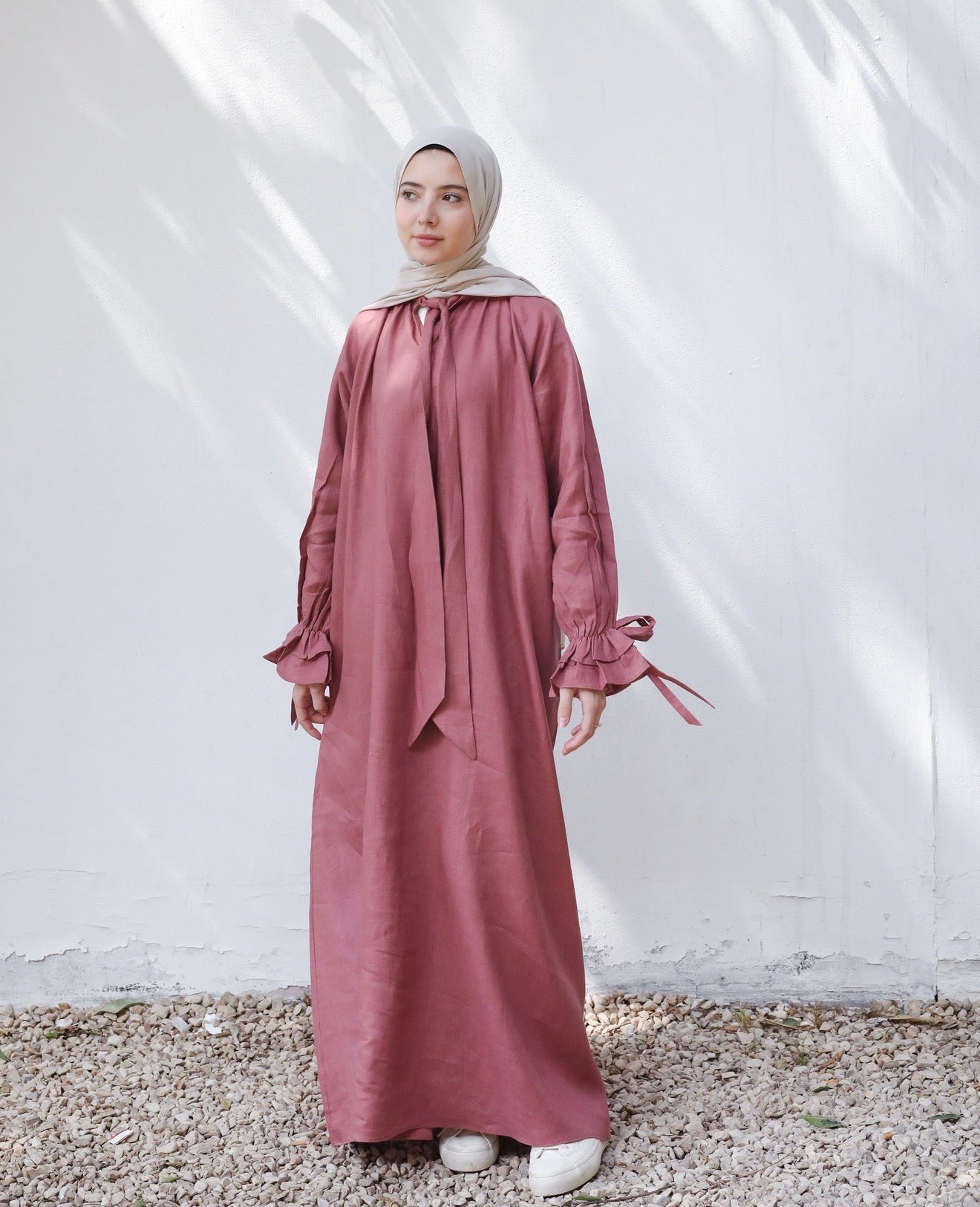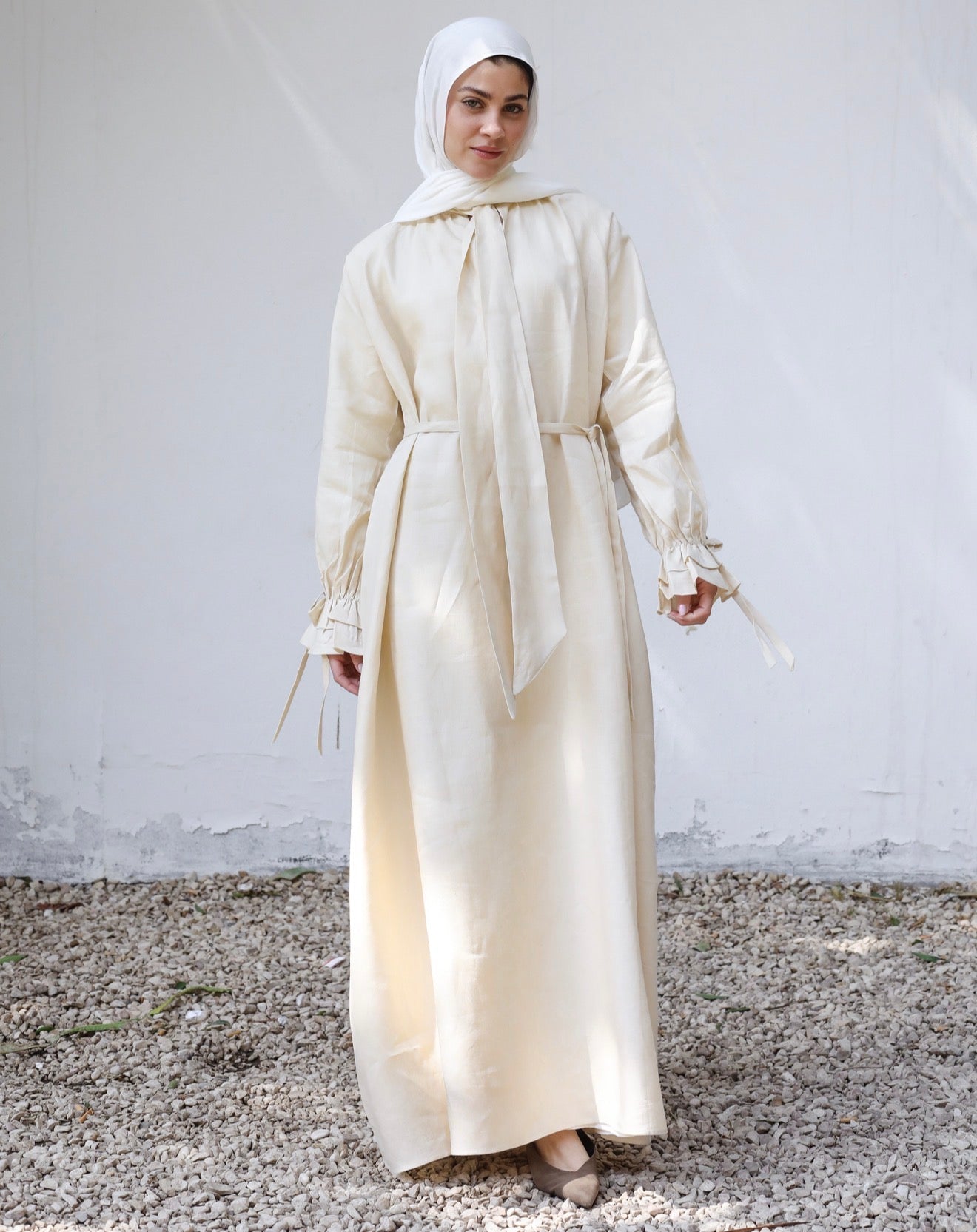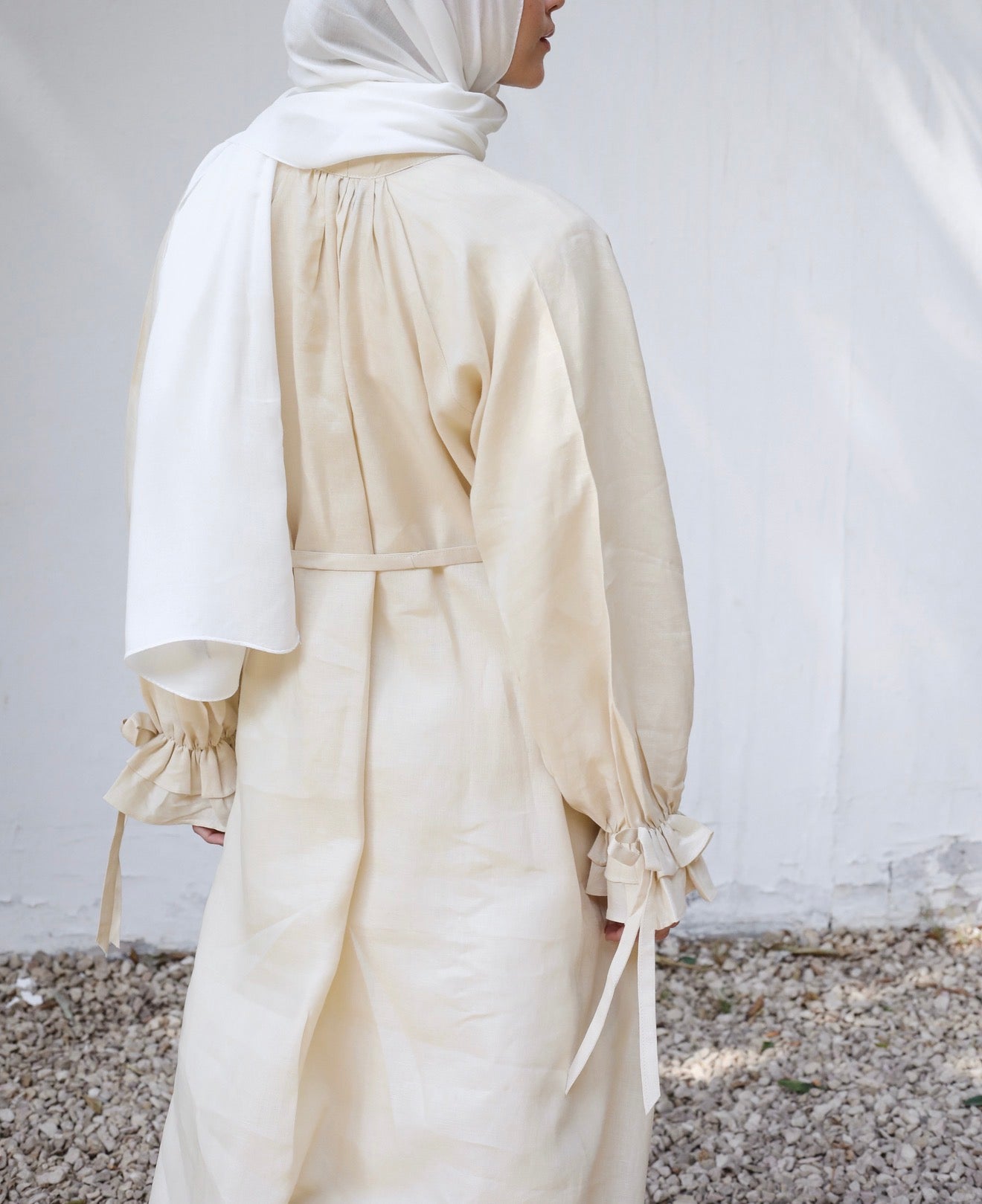 Long sleeve midi dress featuring a soft flowing silhouette. Designed with a delicate tie-neck detail that drapes elegantly at the front. Features gathered cuffs with subtle ruffle detailing and a removable waist belt for an adjustable fit. Crafted in a lightweight pure linen that moves effortlessly for a refined, minimal look.