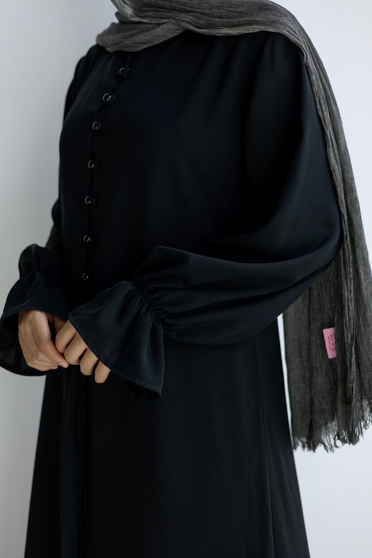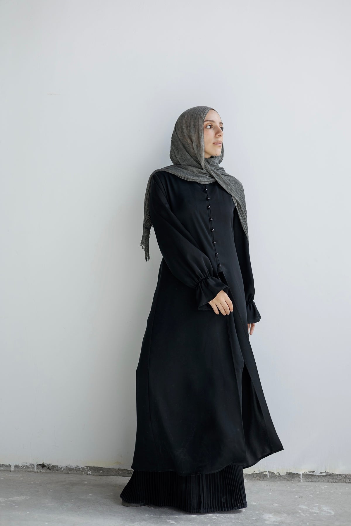 A modern black set defined by its fluid silhouette and effortless flow. Designed with a front-button opening, subtly flared sleeves, and a pleated inner maxi skirt  that adds movement with every step.